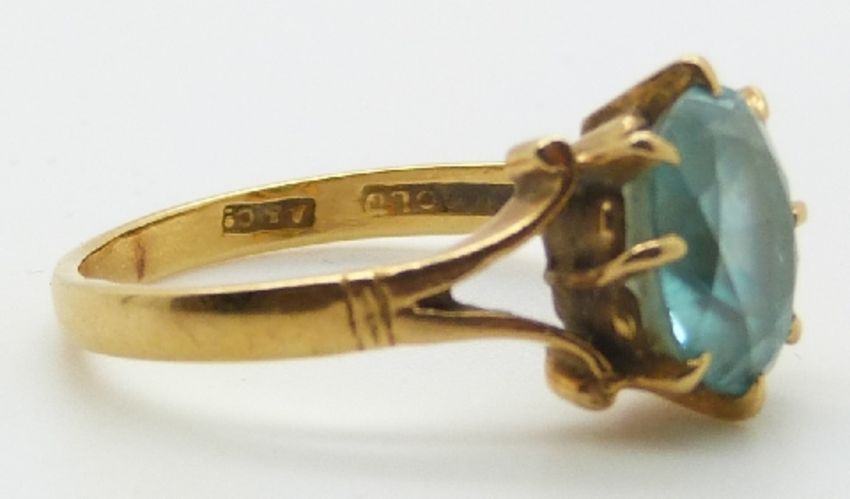 An 18ct gold ring set with an oval cut zircon, 4.0g, size P