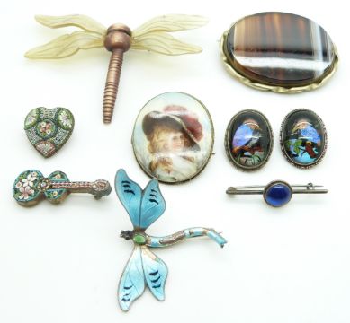 Two silver brooches set with butterfly wing, enamel dragonfly brooch, micro mosaic brooches, agate, etc