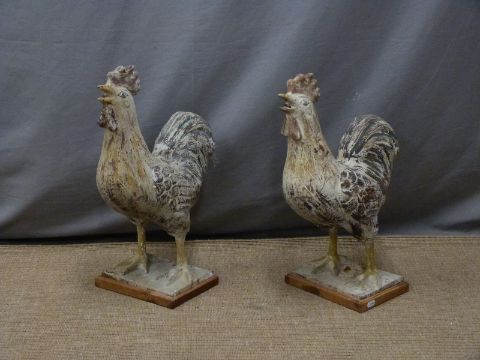 A pair of Chinese pottery cockerels on wooden plinths, height 51cm