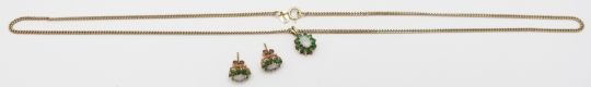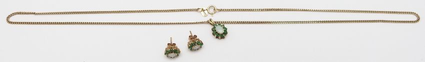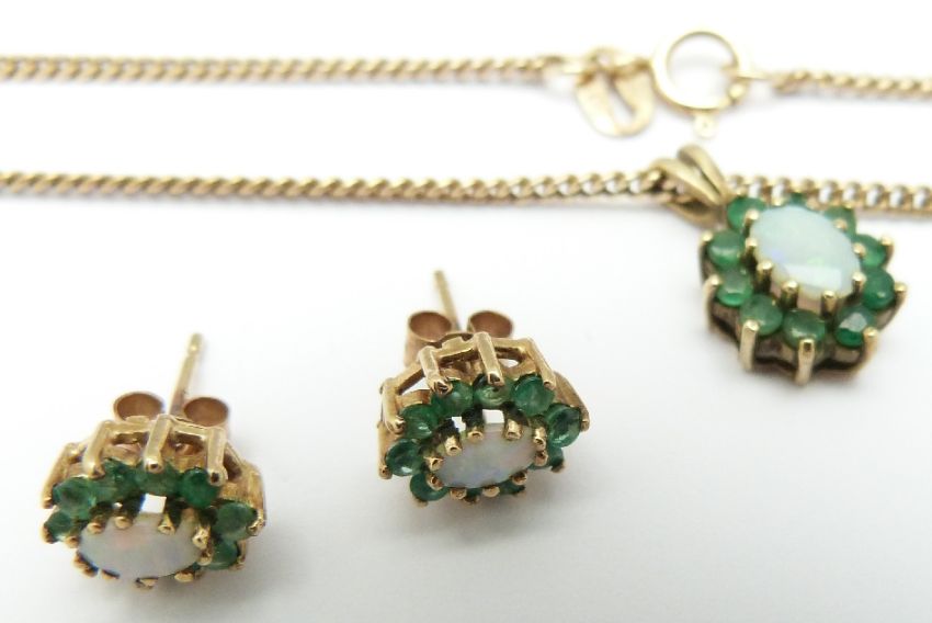 A 9ct gold necklace set with an opal and emeralds, with matching earrings, 7.6g