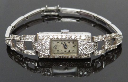 Art Deco platinum ladies wristwatch with diamond set case and bracelet, blued hands, black Arabic numerals, silver dial and Swiss 17 jewel movement, case diameter 12mm, 18g