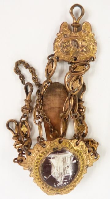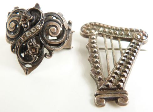 Edwardian silver brooch (Birmingham 1904), agate brooch, Victorian silver harp brooch, small tape measure, chatelaine etc, in a tooled leather box