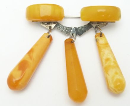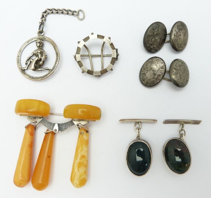 A white metal and amber brooch, two pairs of silver cufflinks, etc