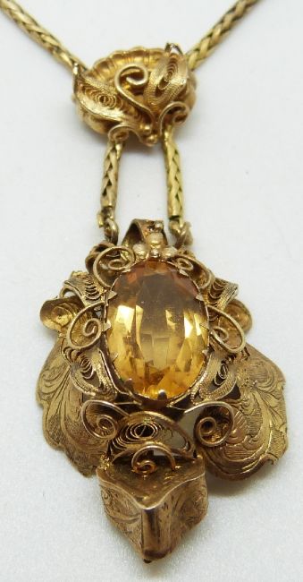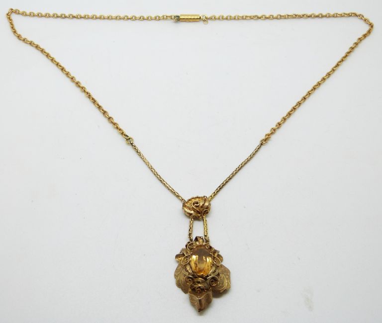 A 15ct gold necklace set with an oval cut citrine within an engraved foliate and filigree border, 8.4g