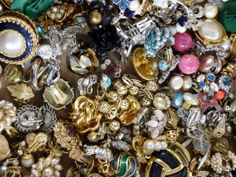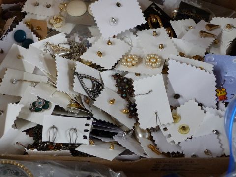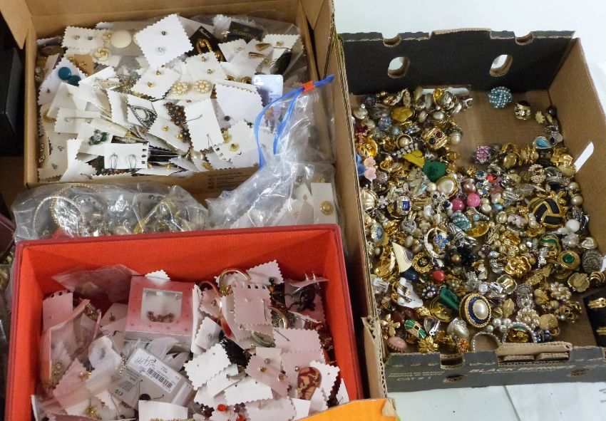 A large collection of earrings, mostly paired and sorted, including vintage examples