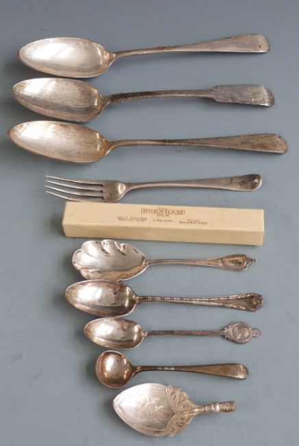 Three hallmarked silver table spoons, Georgian hallmarked silver fork and various hallmarked silver spoons, weight 307g and a boxed Burnham pen