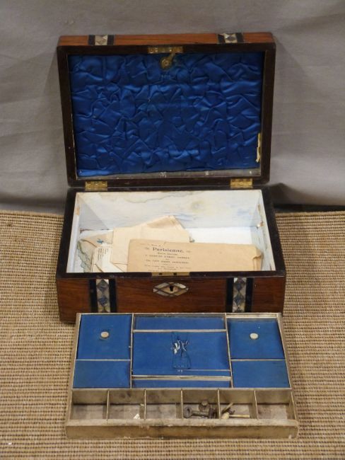 Rosewood work box with mother of pearl abalone inlay, width 30cm