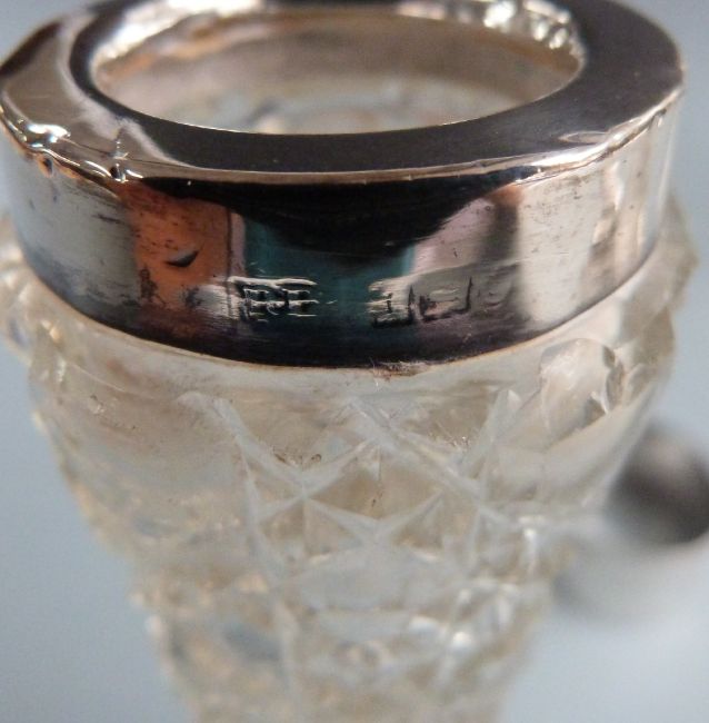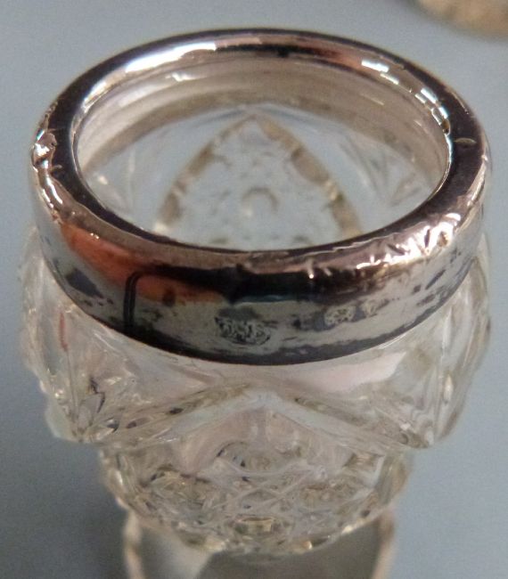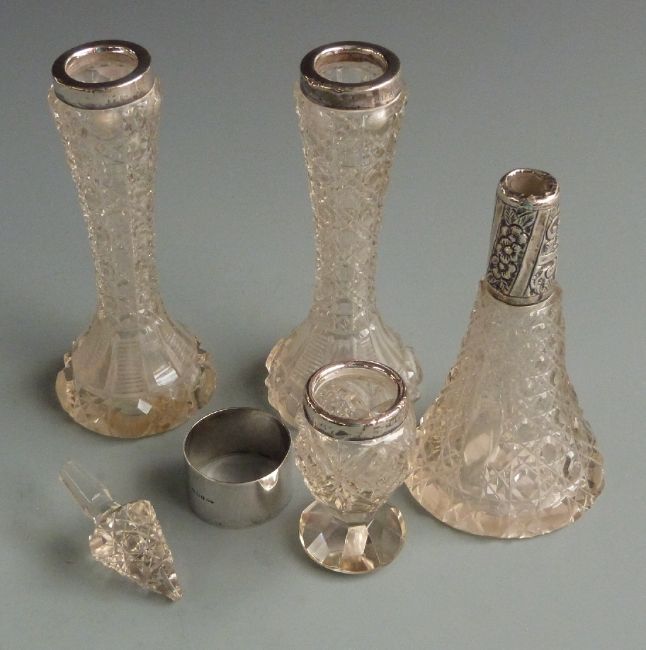 Three cut glass hallmarked silver mounted vases, height 16cm, hallmarked silver cut glass dressing table bottle and a hallmarked silver napkin ring, weight 30g