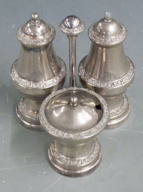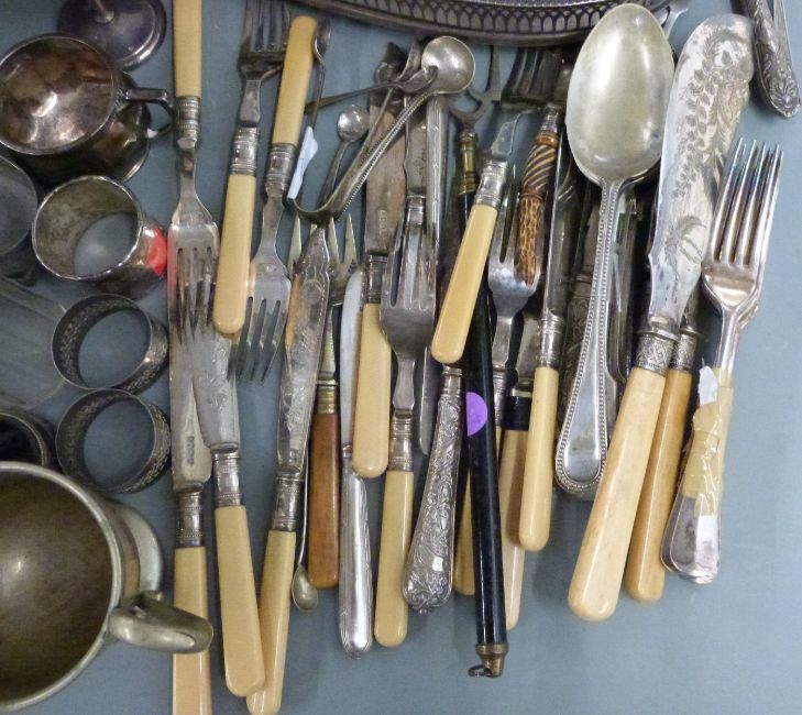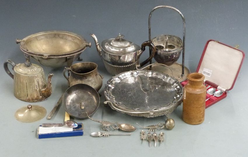 Silver plated ware to include a food warmer with revolving lid, egg coddler, swing basket, teaware, hallmarked silver lidded cut glass sugar sifter with hallmarked silver lid, etc