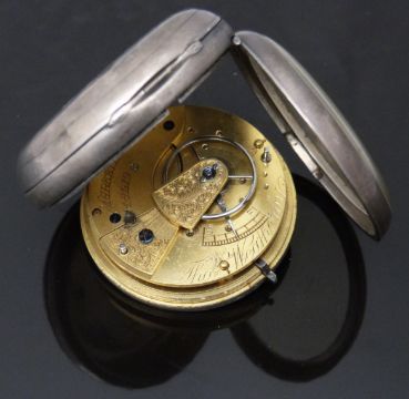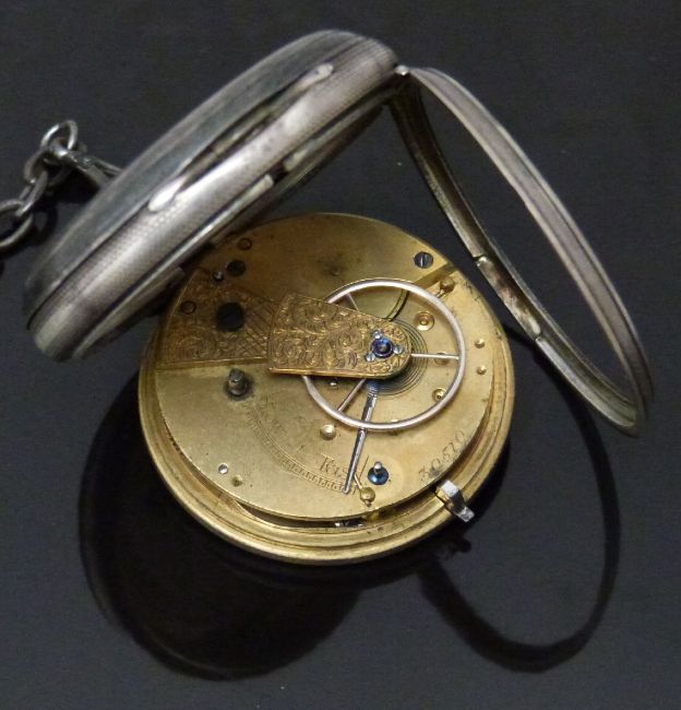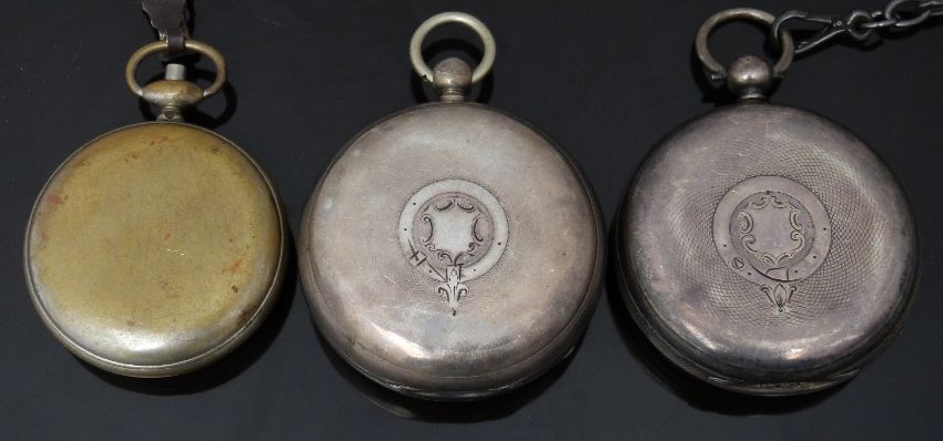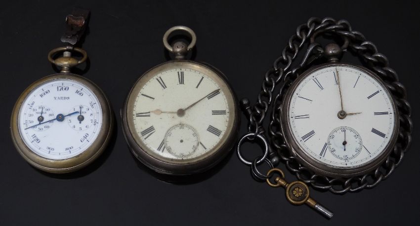 Two hallmarked silver open faced pocket watches both with subsidiary dials, gold hands, black Roman numerals and white enamel dials one by Thomas Weatherby of Market Drayton the other on a graduated chain, together with a pedometer.