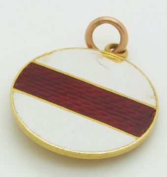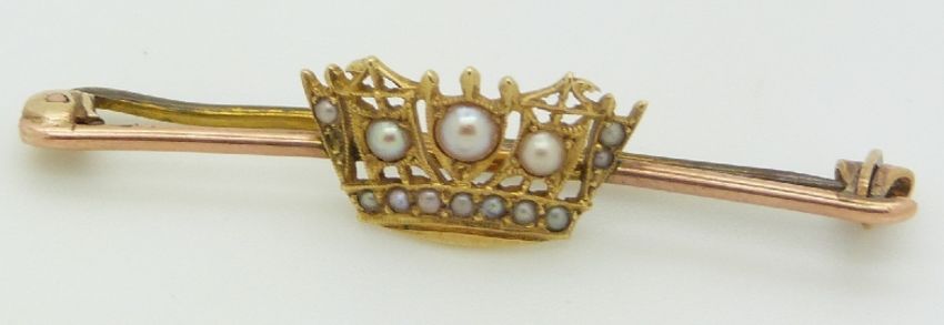 A 15ct gold brooch set with seed pearls in a cornet setting and a yellow metal medallion set with enamel