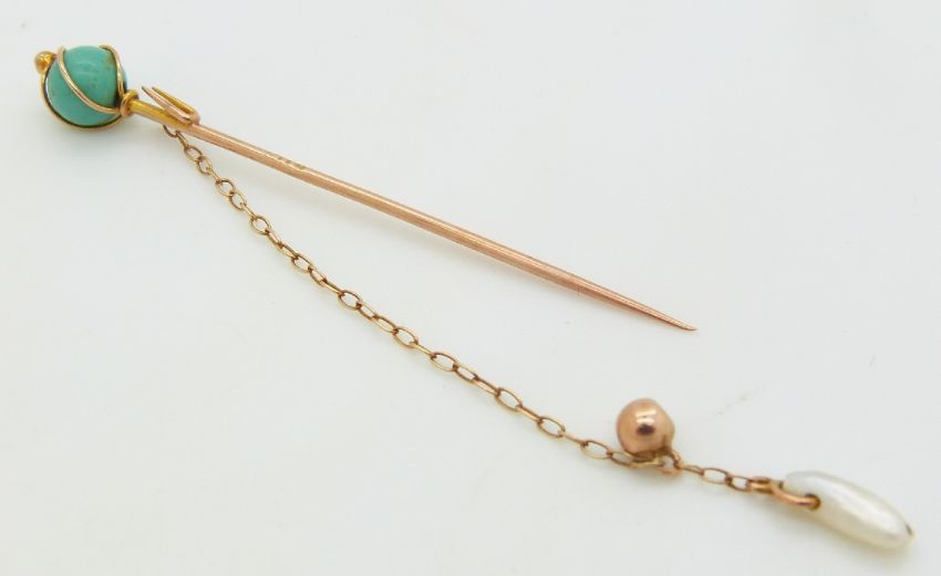 A 9ct gold stick pin set with a turquoise sphere and a drop section set with a pearl, in vintage box