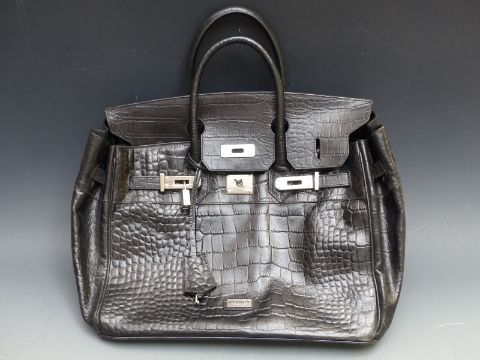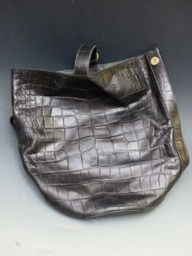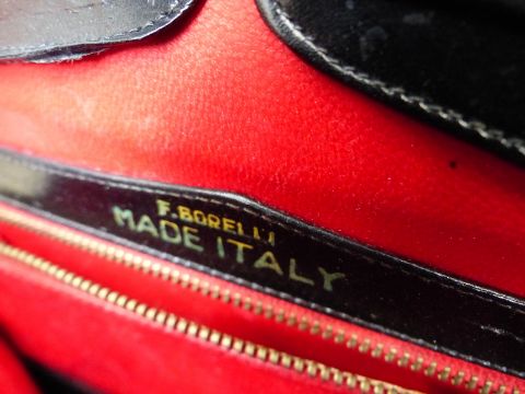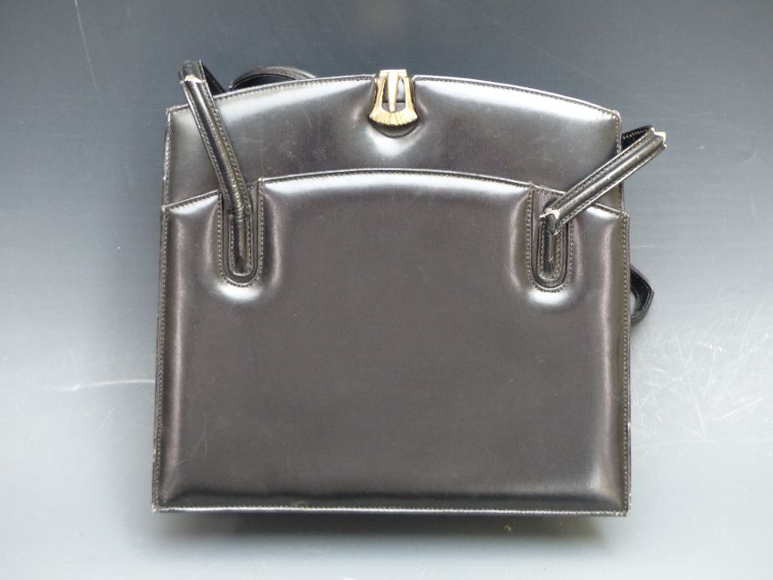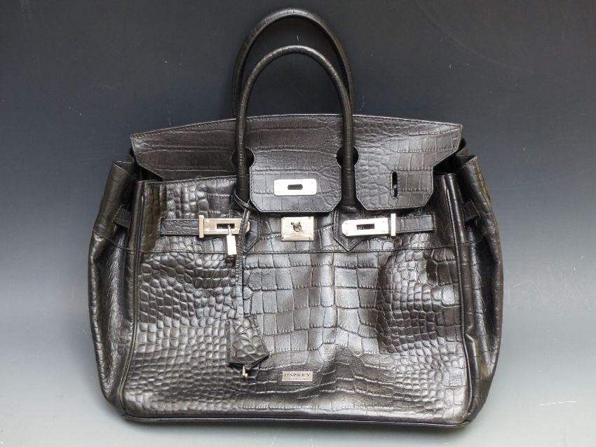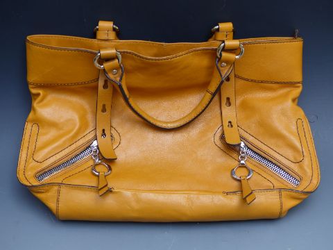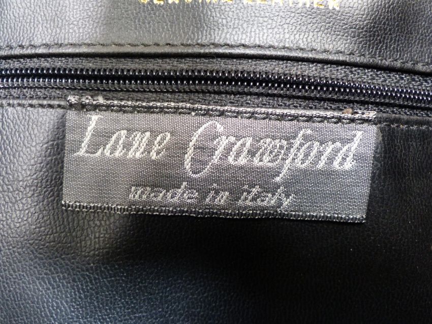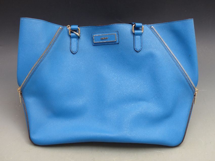 Osprey black leather bag, blue DKNY bag, a black leather Lane Crawford bag, a Frances Cobiasia mustard leather bag and an F.Borelli Italian vintage black leather bag