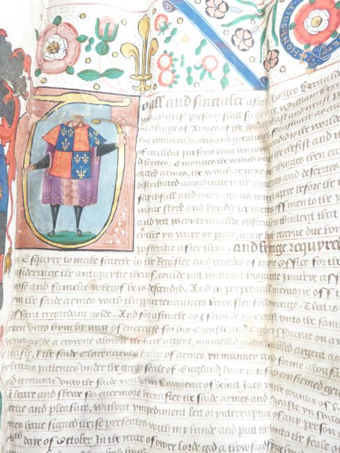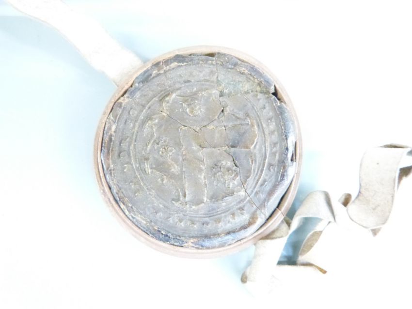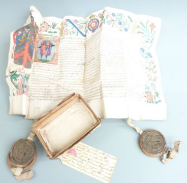 Elizabeth I 1562 grant of arms to William Lawrence of St. Ives MP, with two attached wax seals, in box with attached label suggesting it to be the original box. William Lawrence was a major landowner around St. Ives and also MP for Huntingdonshire in 1554 and 1558. Lawrence's great grandson was an ally of Oliver Cromwell and Lawrence acted as landlord to Cromwell for a property near St. Ives. Overall size including seals 43 x 52cm