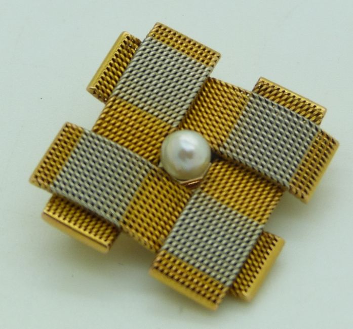 Yellow and white metal mesh brooch set with a pearl to the centre, 11.7g, 2.5cm