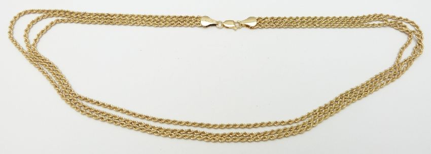 A triple strand 9ct gold rope twist necklace, 6.7g