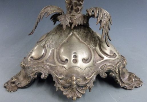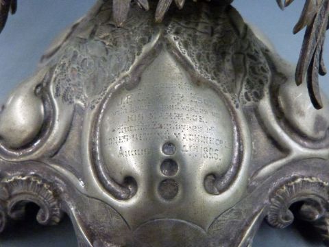 Victorian Elkington or similar silver plated palm tree centrepiece engraved 'From Jones Sewing Machine Company on the occasion of the marriage of J.E. Carver 1895', height 33cm