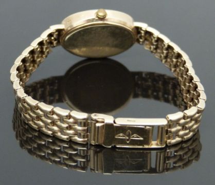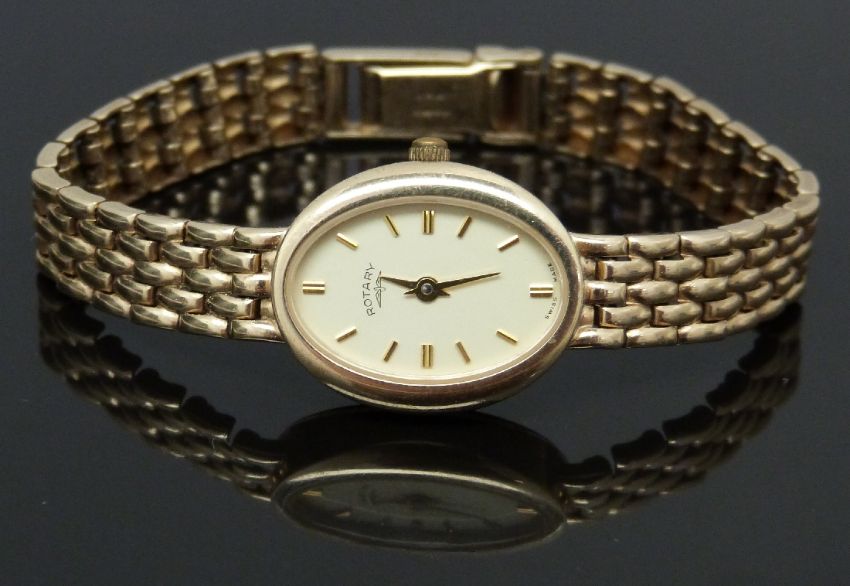 Rotary 9ct gold ladies wristwatch ref. W139-187 with gold hands and baton markers, champagne dial and quartz movement, on 9ct gold bracelet, case diameter 17mm, serial number LB1565, 17.7g, in original box with guarantee, spare links and purchase receipt