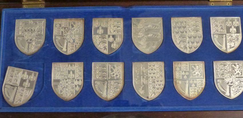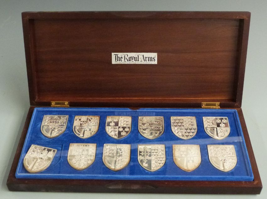 'The Royal Arms', cased set of 12 hallmarked silver shield shaped Coats of Arms, weight 581g