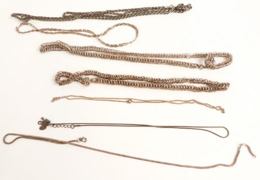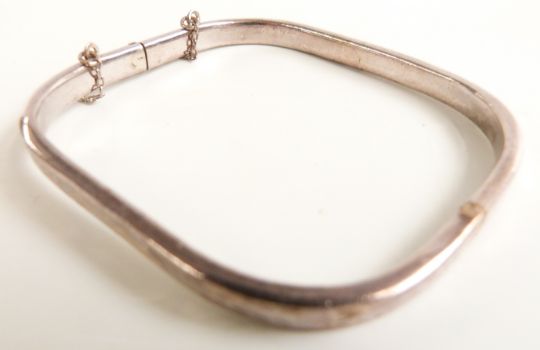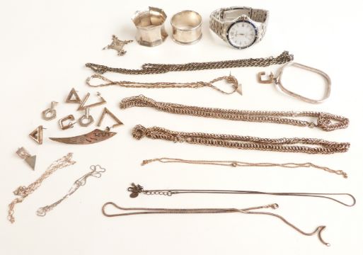 A collection of silver jewellery including bangle, pendants, earrings, chains, Accurist watch, two silver napkin rings etc