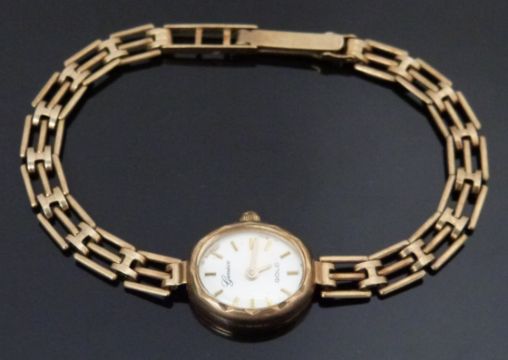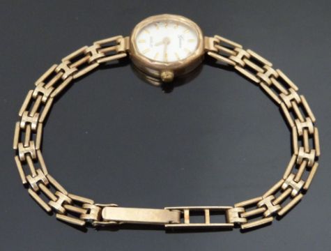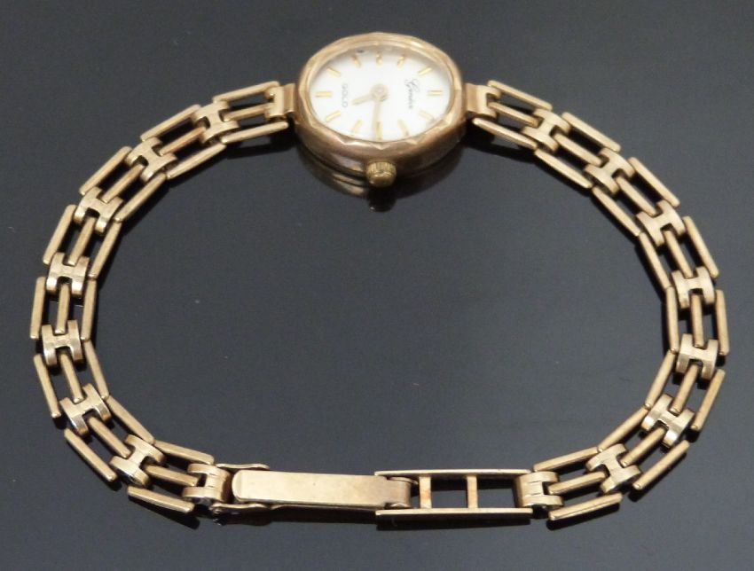 Swiss 9ct gold ladies wristwatch with gold hands and baton markers, silver dial and quartz movement, on 9ct gold bracelet, case diameter 15mm, 8.8g