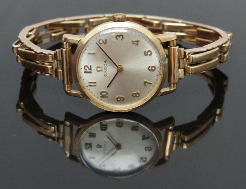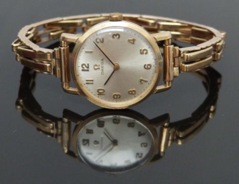 Omega 9ct gold wristwatch ref. 511.5137 with black hands, gold Arabic numerals, silver dial and signed 17 jewel calibre 620 movement, on 9ct gold expanding bracelet, case diameter 24mm, serial number 24081952, 20.6g