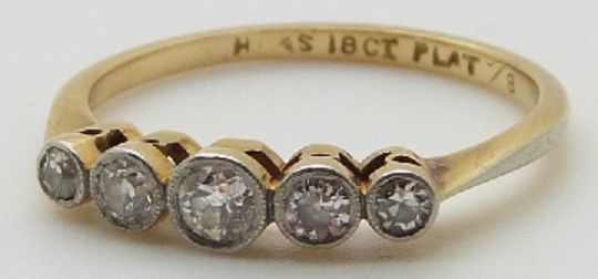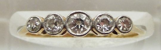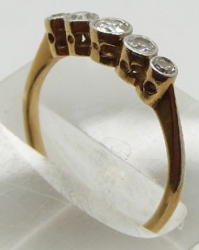 An 18ct gold ring set with five diamonds, 1.9g, size J/K