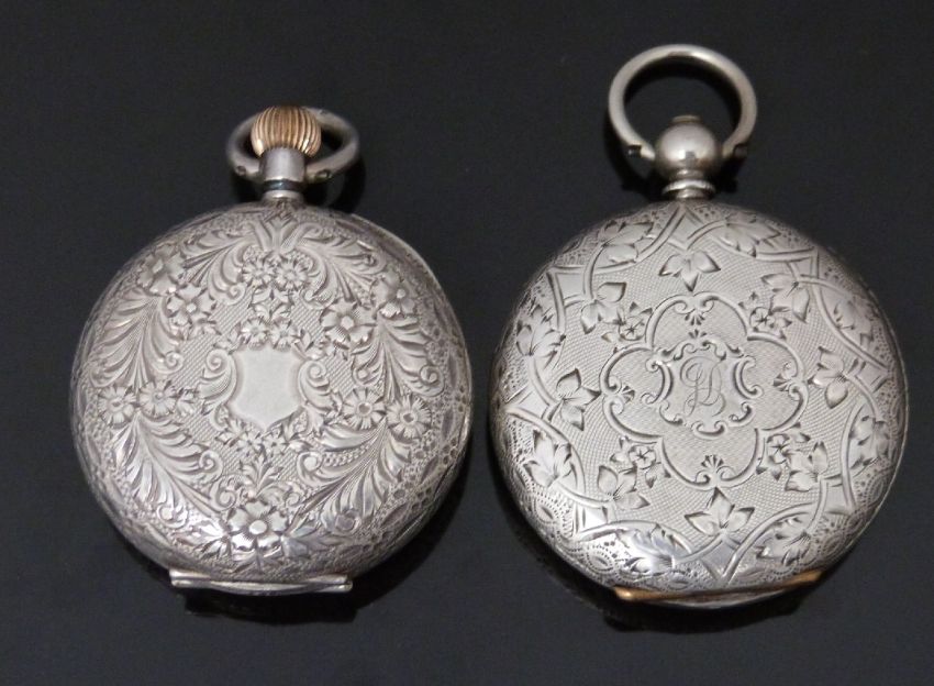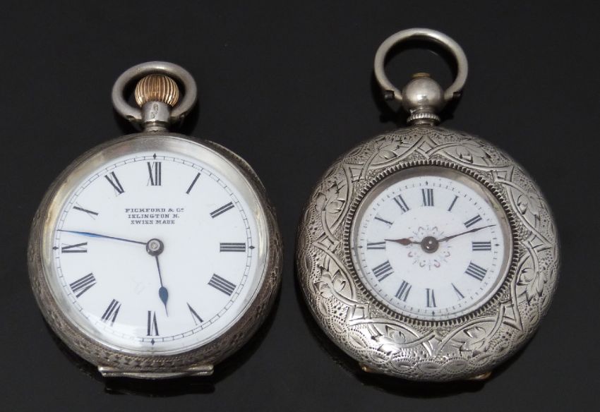 Two continental silver open faced pocket watches, one keyless winding by Pickford & Co of Islington, both with black hands, Roman numerals, white enamel dial and engraved cases, largest case diameter 36mm.