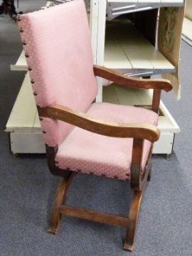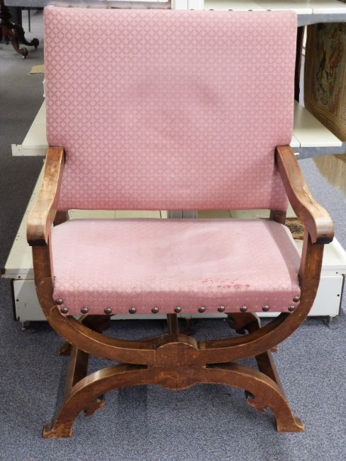 COLLECTING Liberty and Co upholstered oak Roman style chair with stud work decoration and X frame supports, Liberty and Co Ltd, London, ivorine plaque inside frame 76 wide x 116cm high