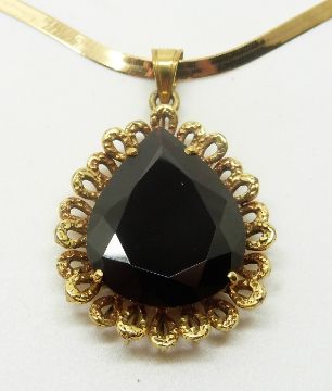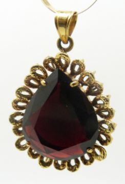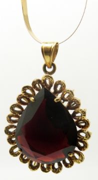 An 18ct gold pendant set with large pear cut garnet on a 10k gold ribbon necklace, 4g