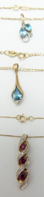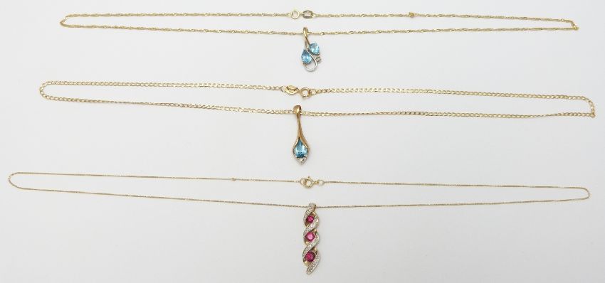 Three 9ct gold necklaces, two set with topaz and diamonds the other with synthetic rubies and diamonds, 5.3g