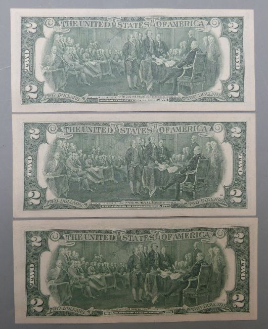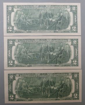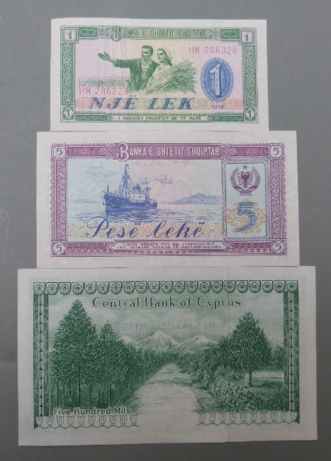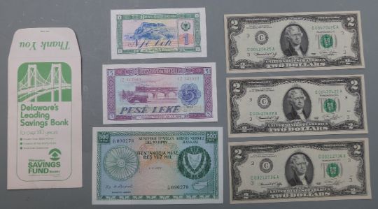 Three two dollar USA banknotes, 1976 bi-centenary, together with two Albanian lek notes and a Cyprus five hundred mils, all uncirculated