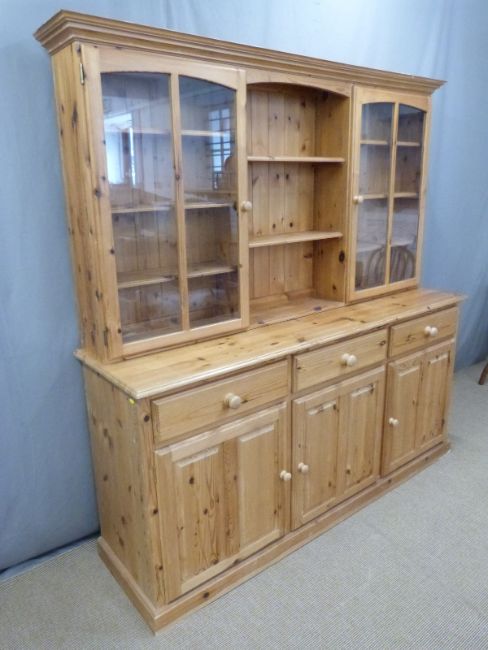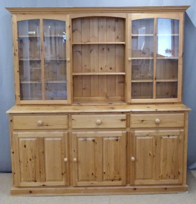 CHARITY Pine dresser, the top having open shelves flanked by glazed display cupboards, the base fitted three drawers over three cupboards, W176 x D48 x H183cm