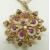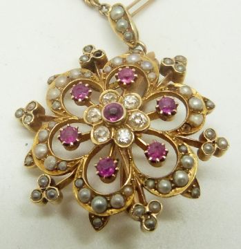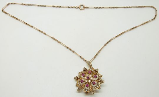 Edwardian 15ct gold brooch/ pendant set with seed pearls, diamonds and pink sapphires, on a 9ct gold chain made up elongated and knotted links, 3 x 3cm,  14.1g