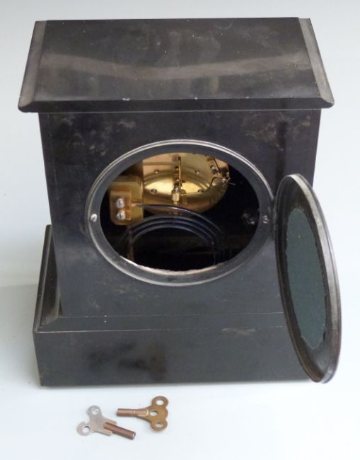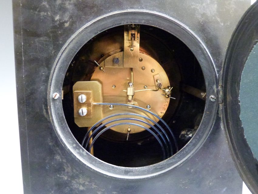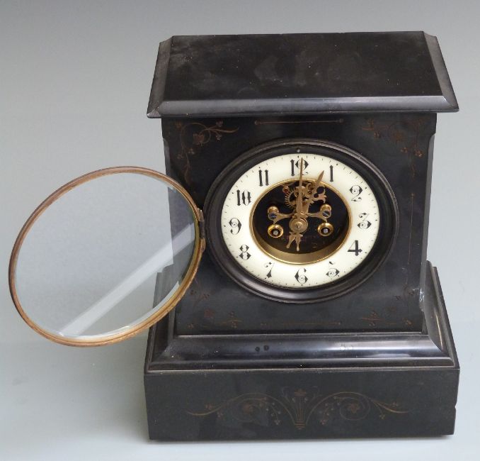 French slate 19thC mantel clock with J M Scarrett & Co, Paris to dial, ivory coloured Arabic chapter ring with gilt brass beetle and poker hands and visible jewelled anchor escapement, the two train movement numbered 11292 striking on a gong, 30cm tall