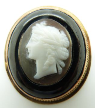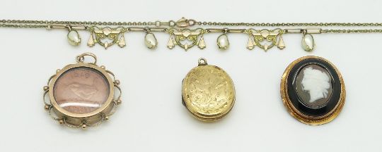 A 9ct gold locket (3g), Victorian locket, 9ct gold brooch set with a cameo and a rolled gold necklace set with blister pearls