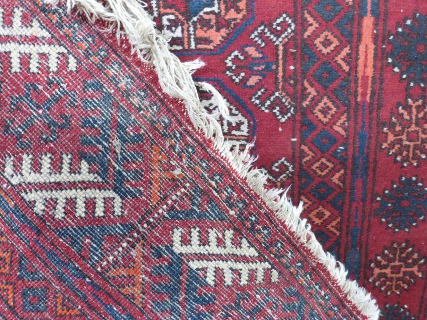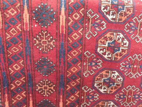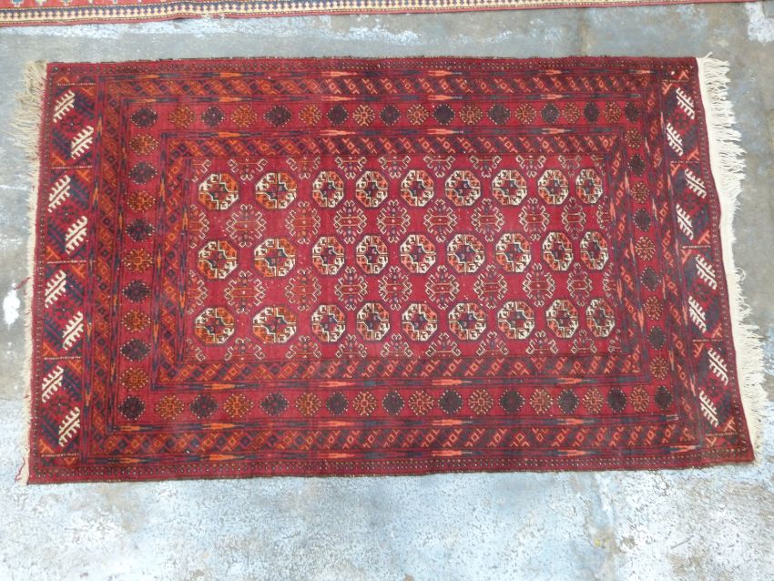Turkoman rug with three lines of gul details on deep red ground within a geometric border, 125 x 210cm