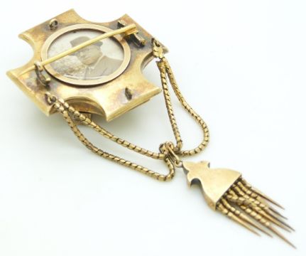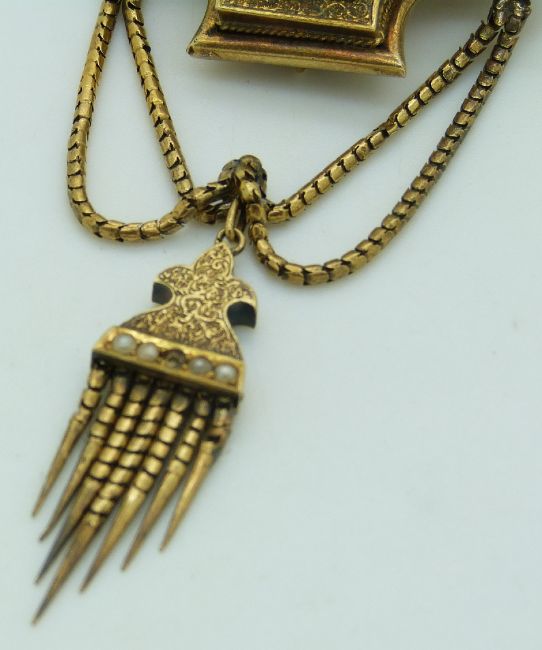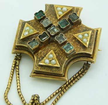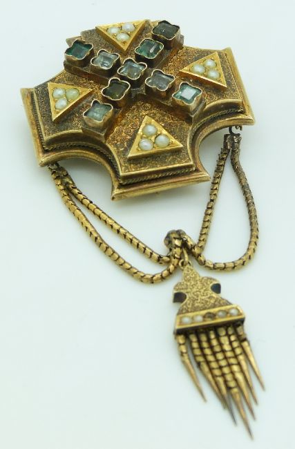 Georgian/ Victorian mourning brooch set with foiled square cut emeralds in a cross design interspersed with seed pearls in triangular settings on a textured background, with a seed pearl decorated tassel suspended on snake chains, 22.9g, 3.9 x 9cm