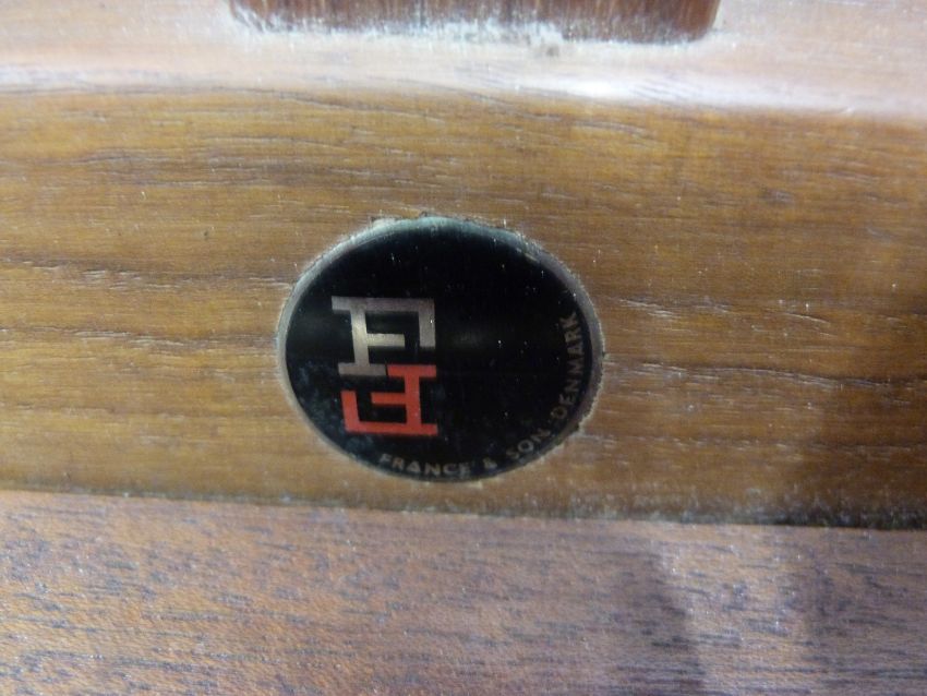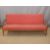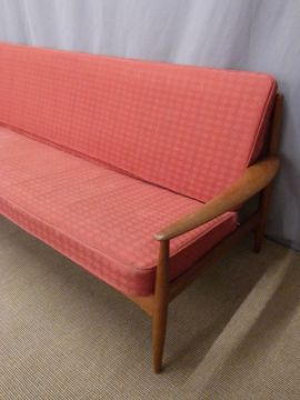 France and Co retro Danish teak sofa with original red geometric design cushions, length 197cm