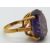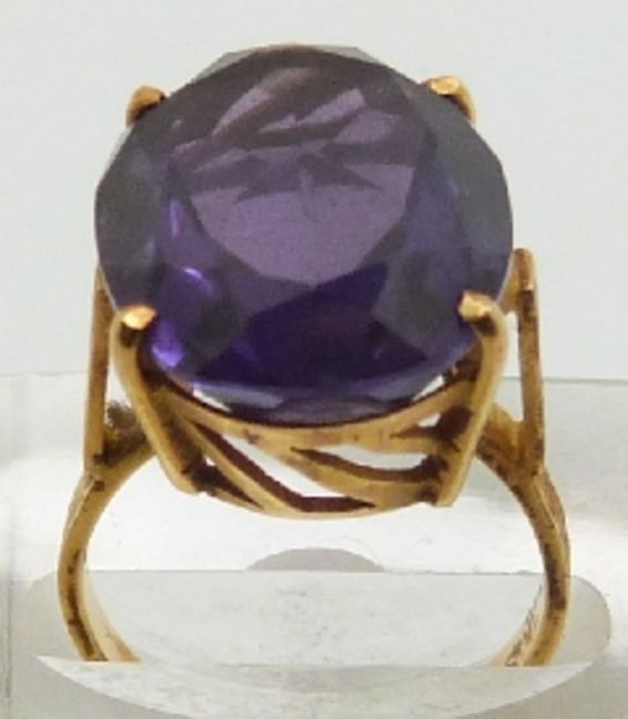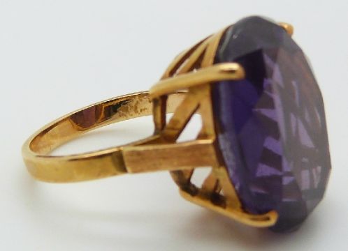A yellow metal ring set with a large oval cut synthetic purple sapphire, 9.3g, size L