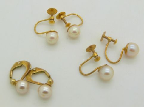 A pair of 9ct gold Victorian earrings, four other pairs of 9ct gold earrings two set with pearls (11.2g) and a silver pair of earrings