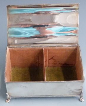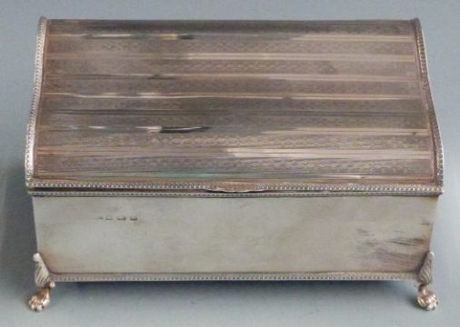 George V hallmarked silver cigarette or jewellery box with shaped engine turned lid, raised on four feet, Birmingham 1932 maker's mark rubbed, width 16cm