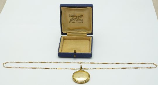 A 9ct gold necklace (2.5g)and Victorian locket with engine turned decoration and textured border, length 2.5cm