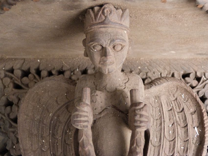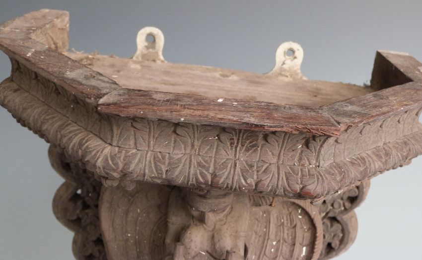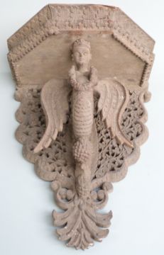 Nepalese/ Anglo Indian carved figural shelf bracket with fretwork decoration, the central figure the Hindu deity Garuda holding Nagas (snakes), H44, W30cm