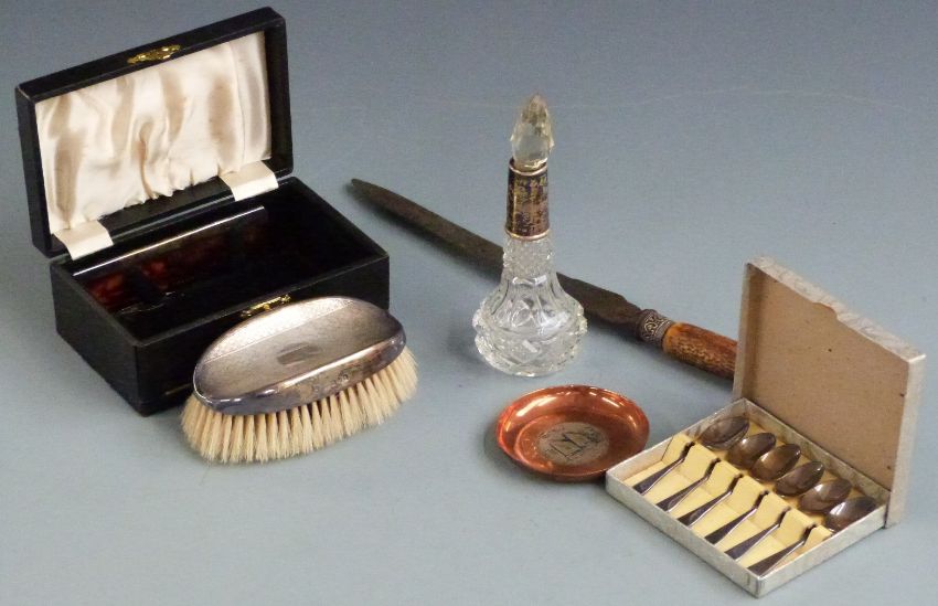 Cased set of six hallmarked silver coffee or teaspoons, weight 43g, cased hallmarked silver mounted brush and comb set etc