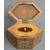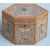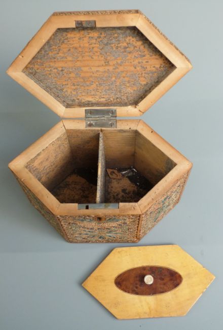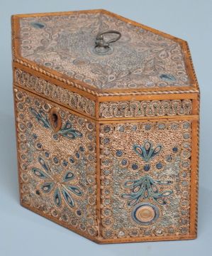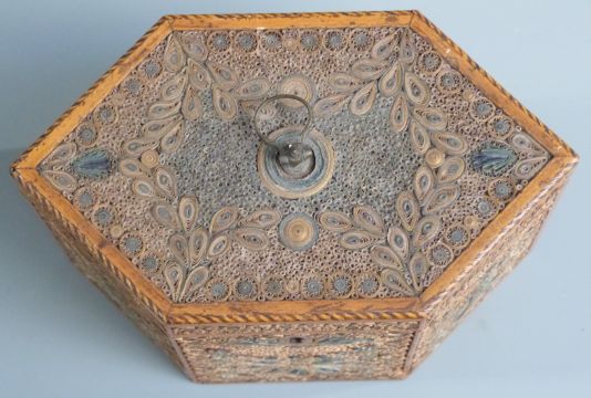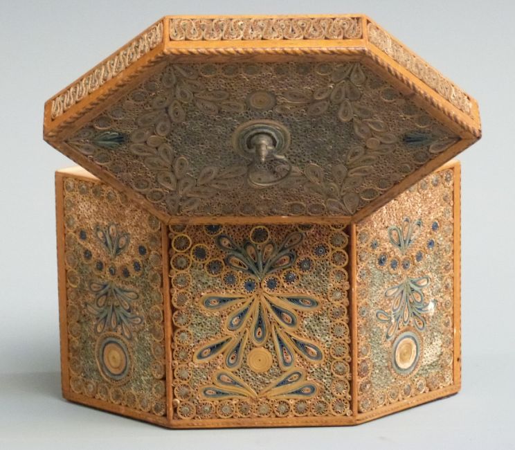 Georgian quilled paper hexagonal tea caddy, each surface having quilled and gilt paper scroll decoration, the lid opening to reveal an inner cover, W18 x D10 x H14cm