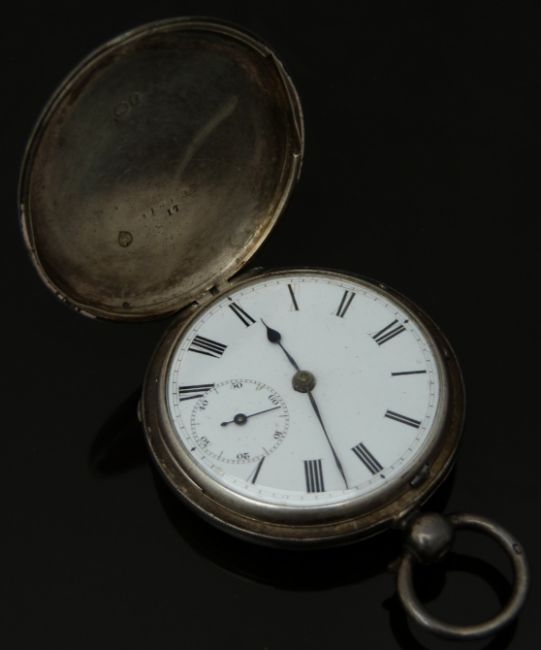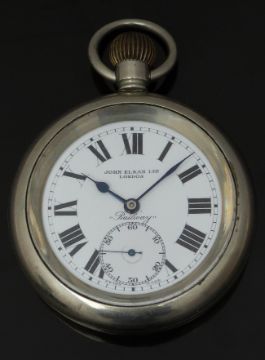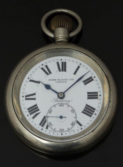 Arnold of London hallmarked silver full hunter pocket watch with subsidiary seconds dial, blued hands, black Roman numerals, white enamel dial and signed movement, case diameter 47mm, serial number 11819 together with a John Elkan Ltd 'Railway' keyless winding open faced pocket watch with inset subsidiary seconds dial, blued hands, black Roman numerals and white enamel dial, case diameter 57mm.