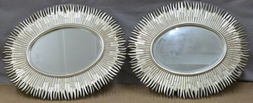 A pair of decorative oval mirrors with silver sunburst style frames, each 97 x 80cm