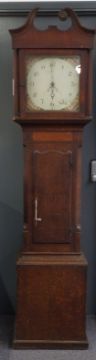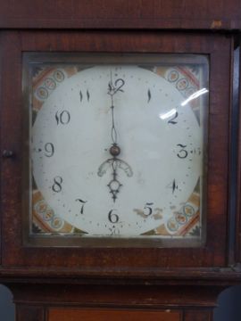 Circa mid 19thC longcase clock, the painted Arabic dial with date aperture, the 30 hour movement striking on a bell, in oak and mahogany case with inlaid decoration, the hood with reeded columns, raised on a plinth base, 204cm tall