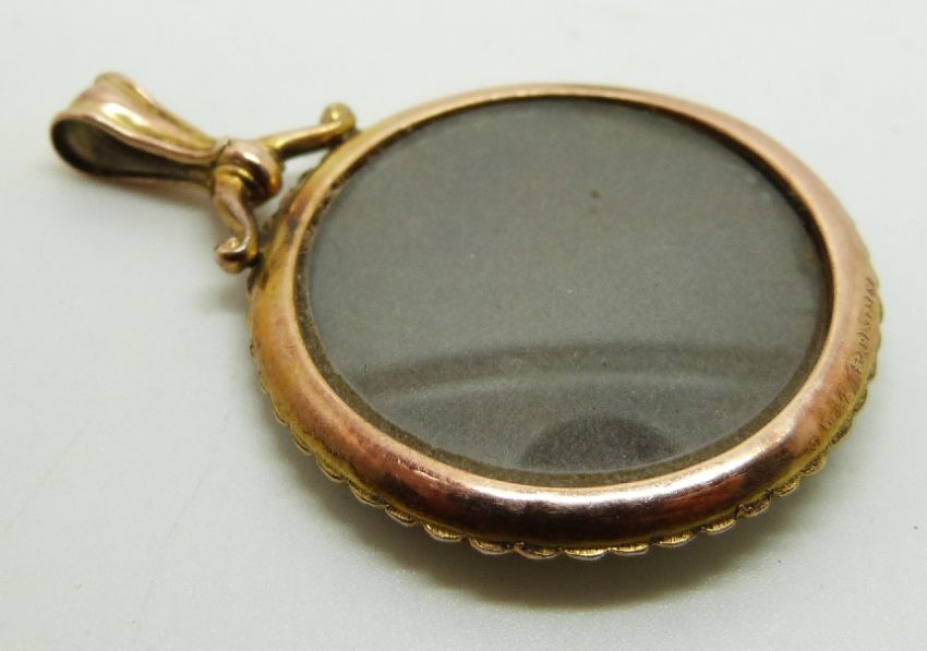 A 9ct gold locket set with a portrait miniature surrounded by seed pearls, 3cm diameter